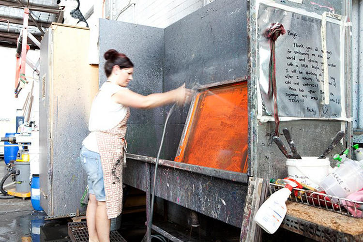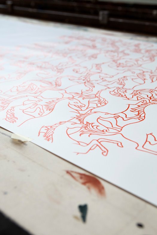 Kiwi stylist LeeAnn Yare really got her hands dirty at the Signature Prints factory in Sydney when she was lucky enough to be given a lesson in screening her own roll of Florence Broadhurst Horses Stampede in tangerine.  Despite the 40 degree heat in the factory on the day, the result was near perfect, and is now gracing LeeAnn’s sons’ bathroom walls.  A long time fan of FB designs, LeeAnn is a huge fan of anything handmade, and this experience has only made her appreciate the handmade process even more. Check out LeeAnn’s own concept store Collected at BLOC, opening on the 22nd March in Auckland New Zealand, where she will be selling FB wallpaper and fabric, and some one off limited edition surprises.