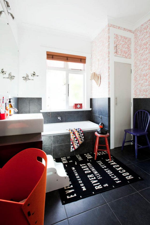 It's such a great bathroom – the walls in white & with the handmade wall paper, tiles in black -grey & orange details. Great combination, thanks for sharing:)
