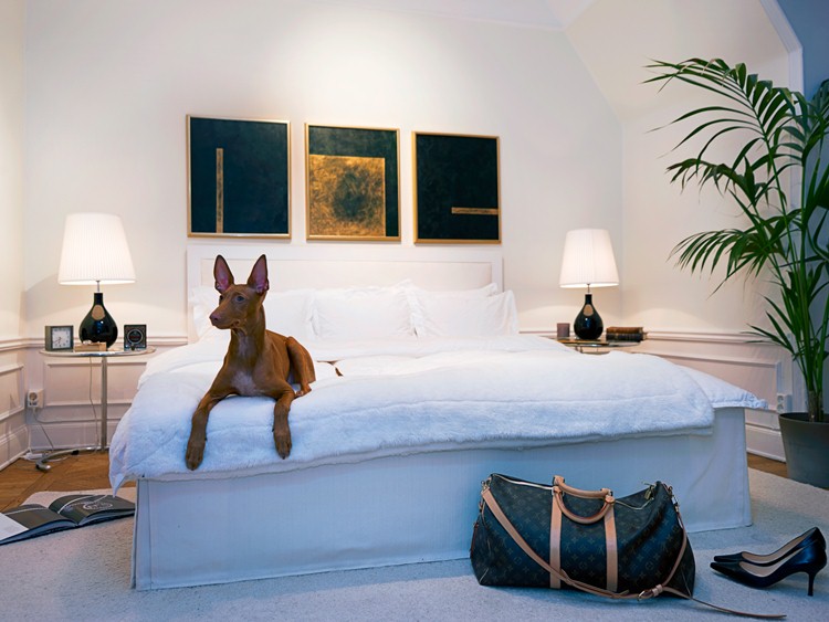 I work as a interior designer in Stockholm. I saw that you are looking for photos of pets on furniture and I thought of my beautiful Pharaoh Hound “Cleo”. She is only 4 months old at the picture and the photographer and I spent many hours and a lot of meatballs trying to get a good shot… But finally we made it! The bedroom on the picture is designed by me and my Stockholm based interior design company Stargo.