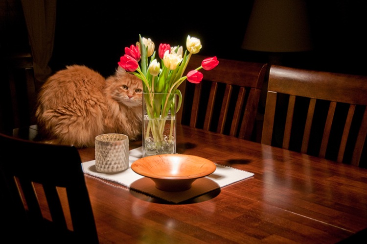 This is Tango, who unlike most cats likes to be in the picture, even if that means being on the dining room table!  I was setting up my camera to create a still life of the tulips and cedar bowl