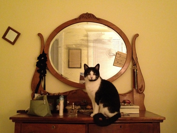 My cat, Princess Jasmine, perched on my antique dresser. She showed up at my door almost 6 years ago and has entertained me ever since. The dresser was passed down to me from my Mom’s side of the family and I’ve had it since I was a little girl.