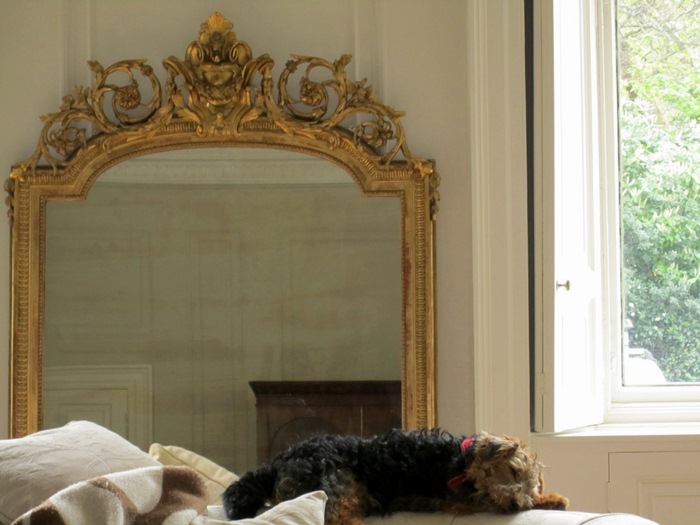 This is Buster asleep on the sofa in Edinburgh, Scotland….the mirror is French