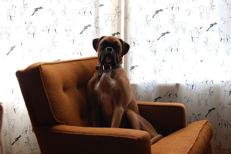 This is my boxer, Stringer Bell sitting in is HIS chair. The chair is a vintage piece my neighbor had placed on the curb. He said it was taking up space and was setting it out for bulk trash day. I scooped it up and it found it’s place in my living room…after a good washing. The dog, Stringer Bell, named after the character from ‘The Wire’, was supposed to be an aborted puppy along with his three brothers. I worked a vet clinic where a client came in with a near-to-term pregnant boxer. She said she “didn’t have time for puppies” and she needed to spay her dog immediately. The doctor reluctantly obliged but the vet techs, myself included, had other plans to remove the puppies and hand rear them. Stringer Bell was the one I pulled out and helped him breathe his first breath. I bottle fed him, my chihuahua trained him, and we all loved him. My foster puppy soon became another very much loved addition to our family. And the chair….well the chair was a perfect lookout point and a great place for Stringer Bell to sit like the gentleman he is.