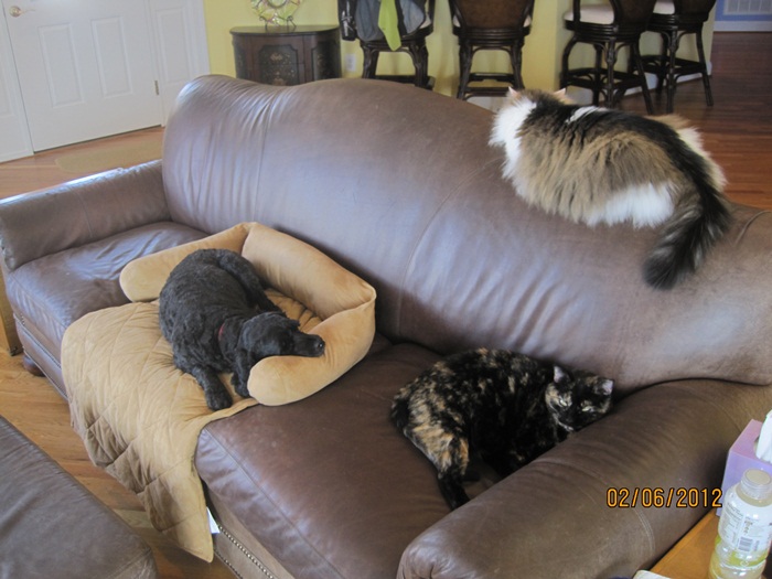 Here are carl & sambolina my cats sharing couch space with my dog, gertie. Afternoon naps are a favorite for all 3.
