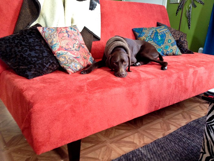 Indy thinks all pieces of furniture in our house belong to him. Here he is sitting proudly in my armchair, and then lounging on the large couch we designed and built ourselves.
