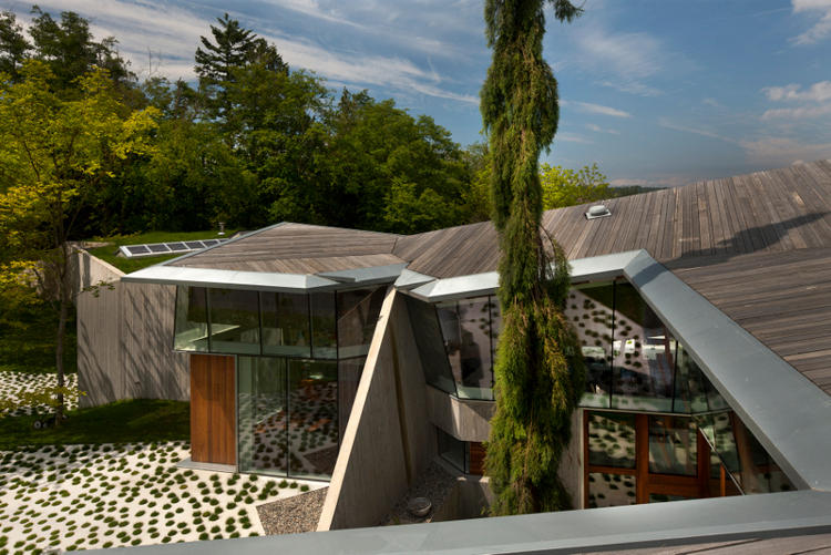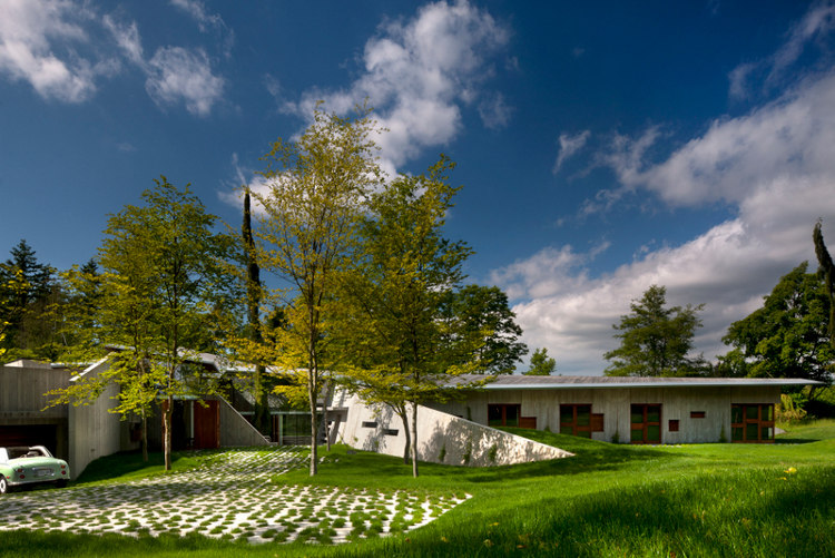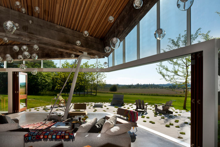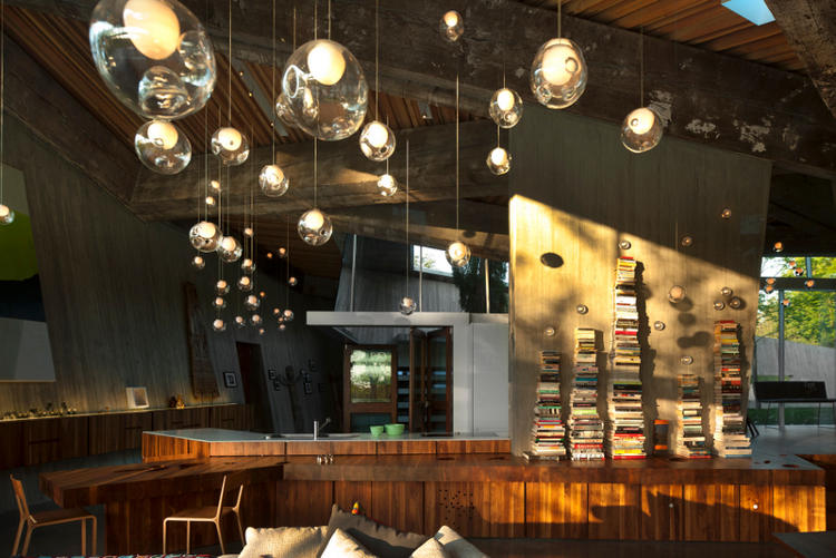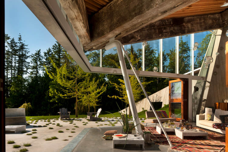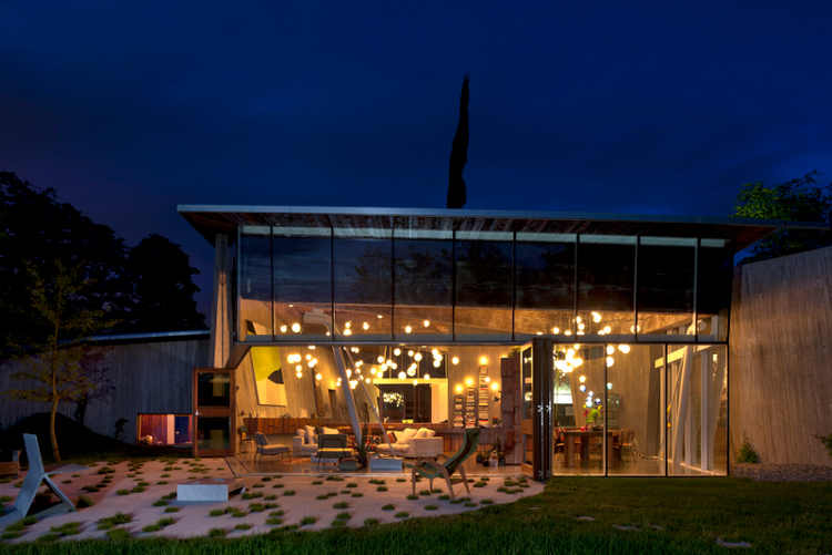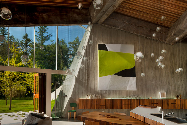 Rising from a gentle slope between two stands of trees is an extraordinary house. Concrete and glass, steel and massive reclaimed Douglas Fir beams. Triangles folding on each other and unfolding on the landscape. Monolithic presence lightened by walls of folding glass doors. It’s like being under a cave like overhang. Shaded and cool, protected and enclosed looking out on the world. The weight of the concrete house rising from the earth juxtaposed with waving fields of grass, echoed by the mass of trees. Manmade vs nature. Solid form vs open spaces. All magically illuminated by “glow worm” lights hanging from its cave ceiling. A family house built on rural acreage designed by Vancouver based architect Omer Arbel.