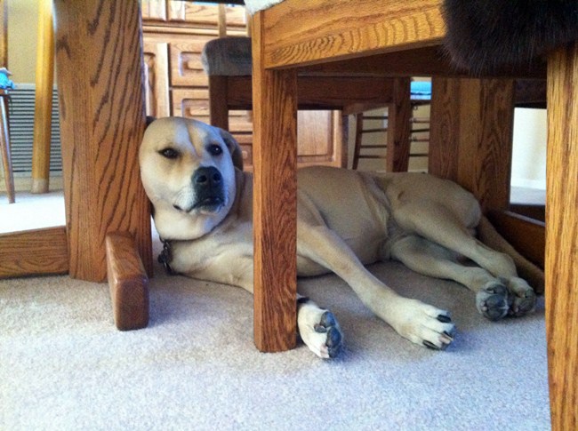 Lily is a lab mix lounging at Grandma’s house after a walk in the desert.