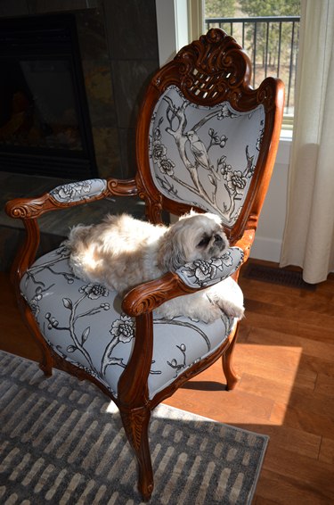 The Shi-tsu in the pictures is Mocha. Mocha is lounging and suntanning on an antique chair that has been reupholstered in Dwell fabric. In the last attached picture, my husband painted a portrait of Mocha which graces our fireplace mantle!