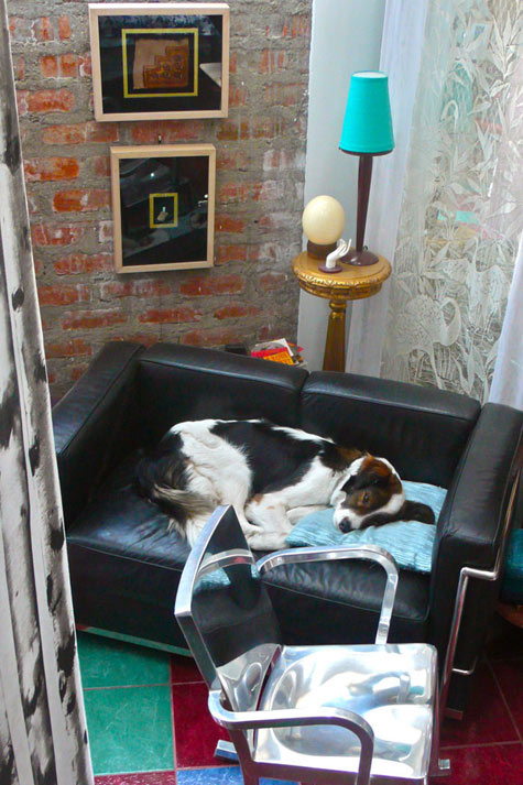 I very happily live in Arequipa Perú with three dogs. This the the big one, Avilés, a street dog before we became friends and he moved in. The photo is of a small corner of the house where my tiny office is. I included the chair but omitted the desk because my 27″ Cinema Display (which is actually larger than the desk!) would make it look like an Apple ad.