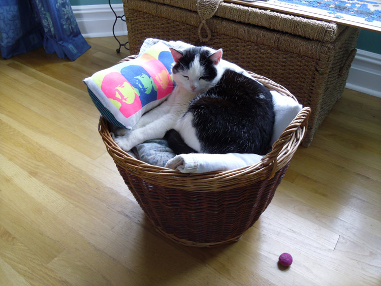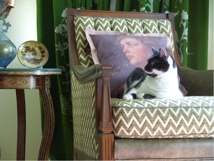 This is my lovely rescued cat, Sqeek, so called because that’s the noise she makes instead of meowing. When not curled up in my mother’s favorite basket cuddling her Beetles pillow, she’s snoozing on my mustard ‘ugly’ armchair, also rescued from a skip in New York city.