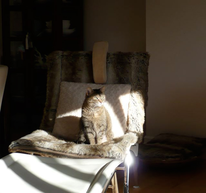 This is my lovely manx cat Tobi lounging in his two favorite places. I think he enjoys the warmth the sunshine brings to the spot within the living room. He is resting on a re-covered hotel chair and our large shadowbox table.