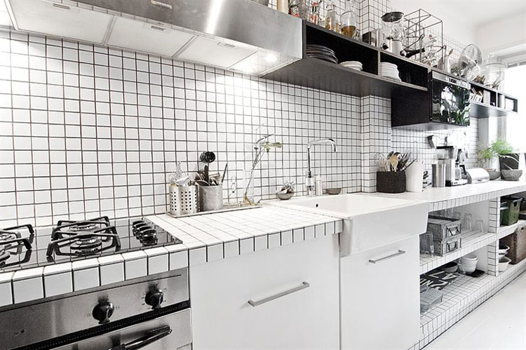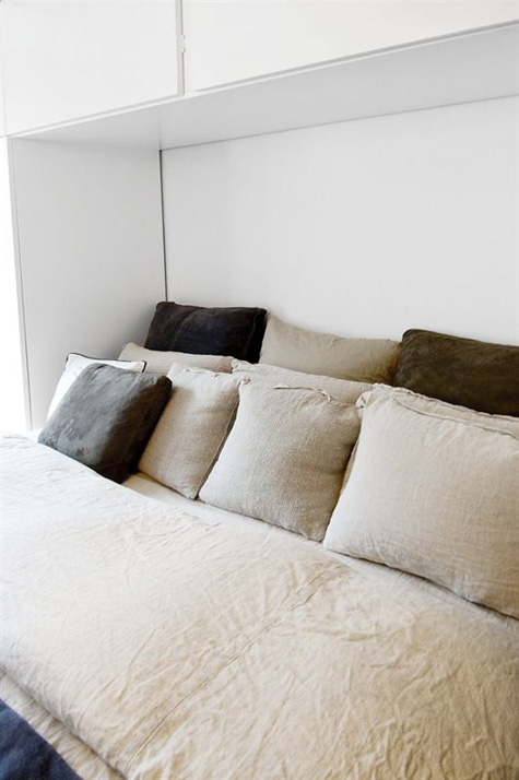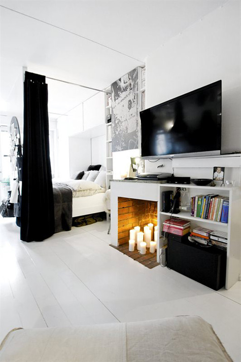 My twin sister sent me a link to an awesome little Swedish apartment for sale. According to the photo of the plans it’s a studio but has all the amenities – decent sized kitchen, a great built-in desk, lounge chair for TV watching, washer/dryer and a balcony. What’s even better is the decor – it’s everything I’m obsessing with these days – black/white/touches of wood, industrial lighting, white tiles with dark grout, linen…..