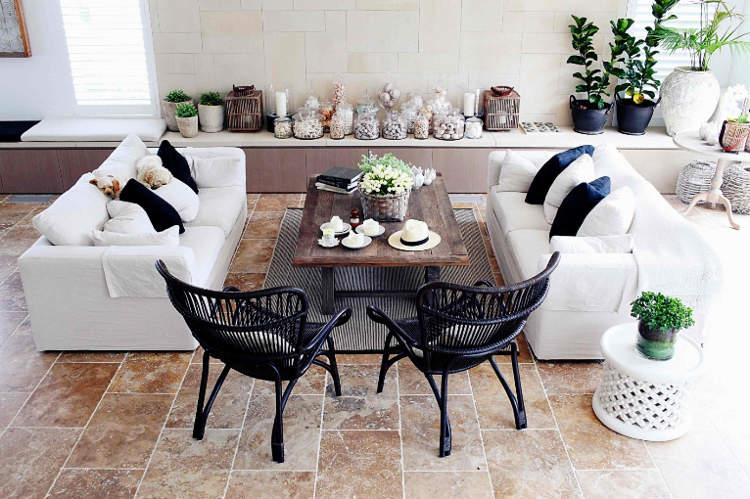 Ha! The shots here are so 2000s. Time warp! Blurry moving owner, designer dog allowed on furniture, over white-outed everything, upturned book on bed, coral and geodes, framed fashion mag cover, apothecary and bell jar specimen vases, karate chopped cushions, orchids, oversized retro kitchen mixer. So "style by numbers".