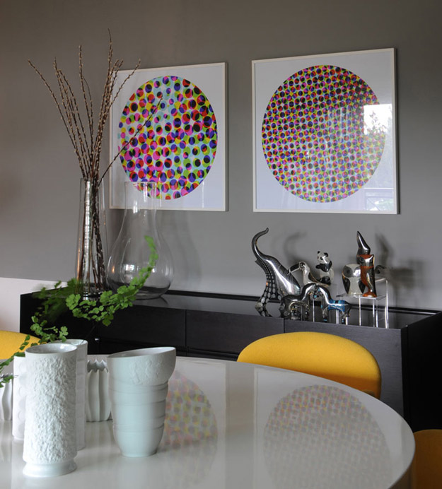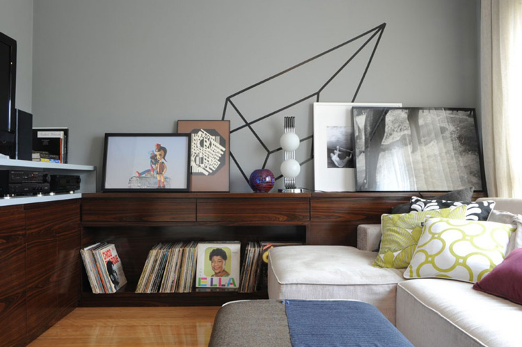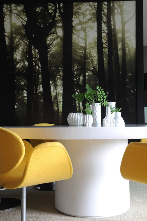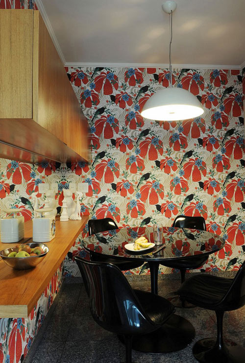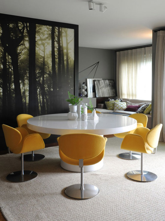 Maurício Arruda is a Brazilian architect/designer whose funky, retro apartment was featured here last year. I stumbled upon his website recently and this apartment caught my eye. (The project is from a collective called WHYDESIGN, whose members are Mauricio Arruda, Guto Requena and Tatiana Sakurai). LOVE the gray wall colour. LOVE the forest mural (I have one too!). LOVE the Pierre Paulin Little Tulip chairs. LOVE the rosewood cabinetry. LOVE the graphic wallpapers. LOVE the built-in workspace. Photos by Marcelo Magnani.