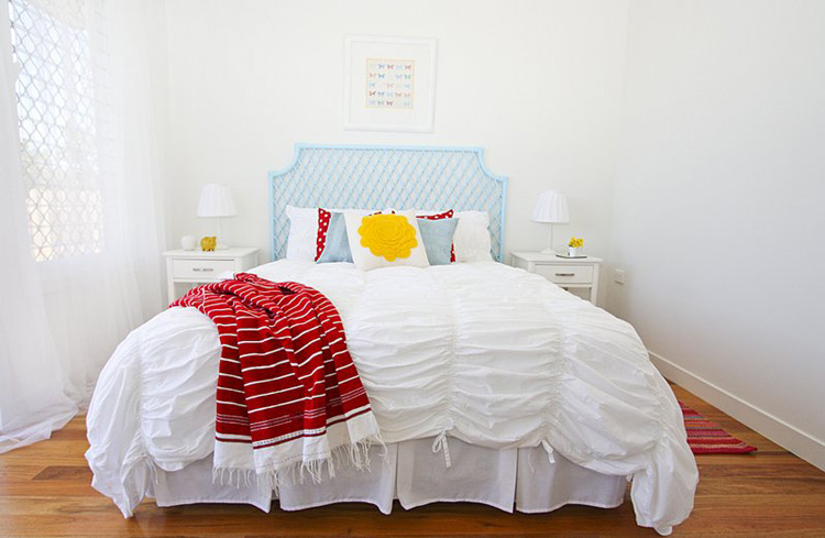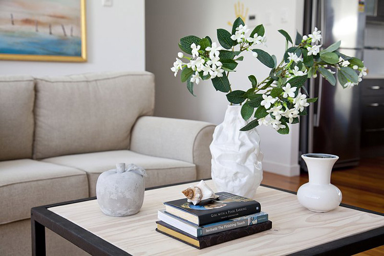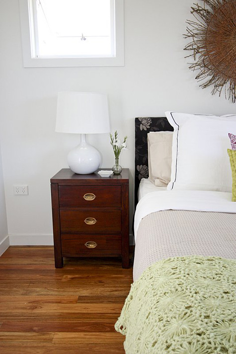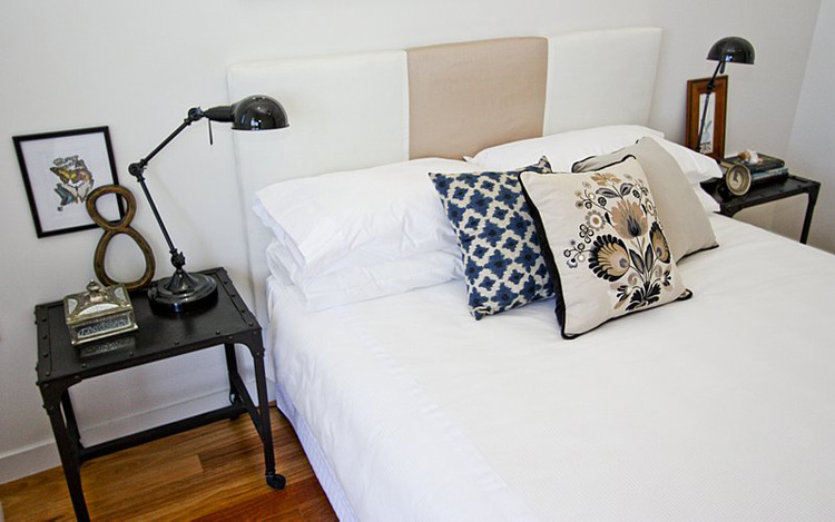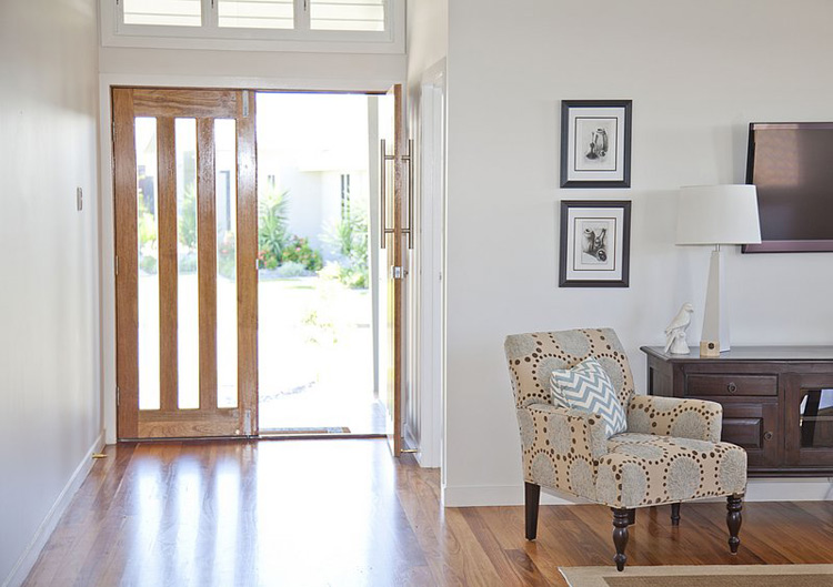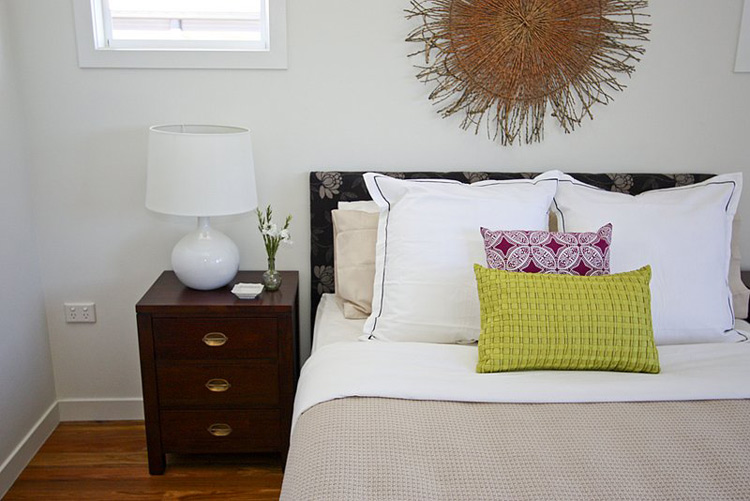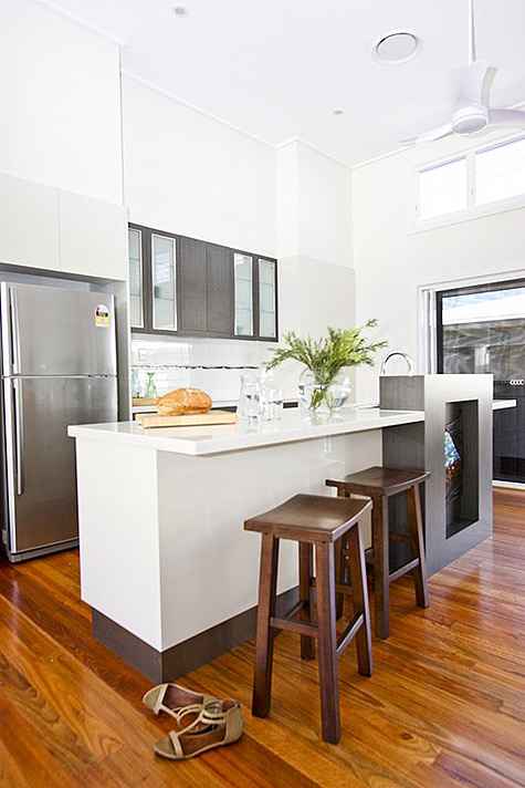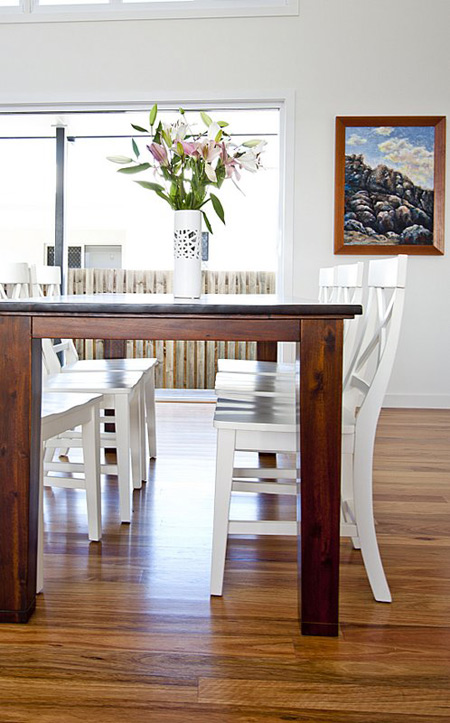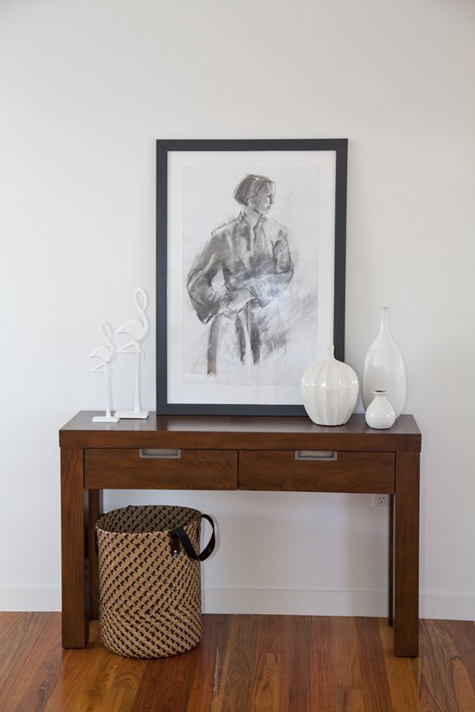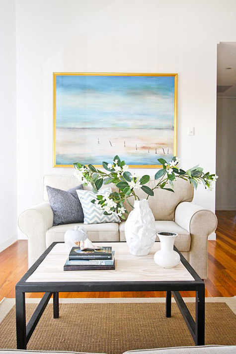 Anna of Ethos Interiors (based in North Queensland, Australia) and the blog my design ethos, wrote us recently about one of her projects: Builder’s display homes in Townsville tend to be very safe and extremely contemporary with white tiles, glass tables and white leather furniture. The house is part of the builer’s Beach House range (and is completely gorgeous) and although I was told to keep it neutral, I wanted to introduce Townsville to the idea of some different styles such as using timber and a mix of modern and vintage pieces. Although it’s not too adventurous for the design world, it was considered very different for a display home here! The budget for furniture for an entire display home in Townsville is less than I would normally spend on one room for a client but I was still pretty happy with how it turned out. Happily, all the beautiful art was lent to me by a local art gallery, Studio 2, which was fantastic as it meant I didn’t have to use generic store bought art! It boggles my mind that builders think new homes need to be filled with modern, cold furniture to attract buyers. I think what Anna has done with this home is far warmer and more appealing. Photos by Naomi Abdilla