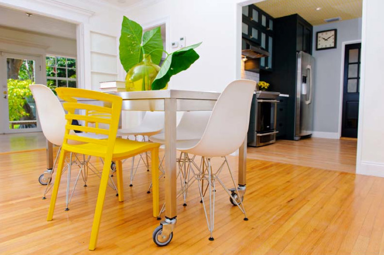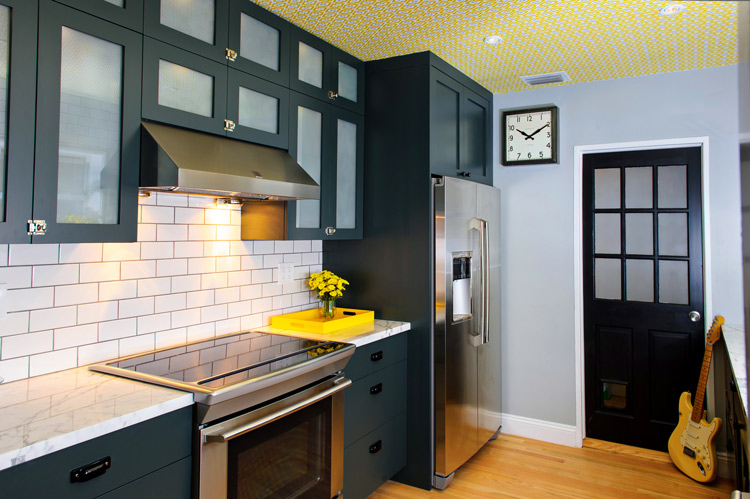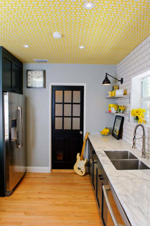 Ruben D Gutierrez of Errez Design sent us photos of one of yet another of his latest projects. (See previous projects herehere and here). Here are some details: I wanted to share some images of a kitchen we just renovated in Miami, FL. This kitchen was designed for a fun creative guy who loves rock and roll and gourmet food. We wanted to make the kitchen feel like it belonged in a 1930’s house but still pop with bold colors and edgy patterns. We used a yellow and grey geometric wallpaper from Jonathan Adler on the ceiling. The yellow tones are also found on the hardwood floors. Classic charcoal grey cabinetry was paired with white marble and white ceramic tile for contrast. Vintage library lamps illuminate the open aluminum shelving. What a fun, bold kitchen! Love it all – the yellow accents, door hardware, wallpaper on the ceiling(!!!), subway tiles….