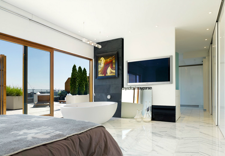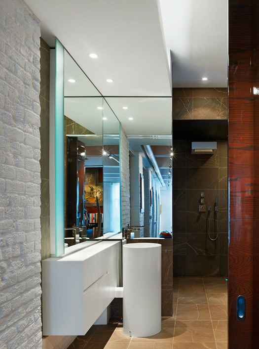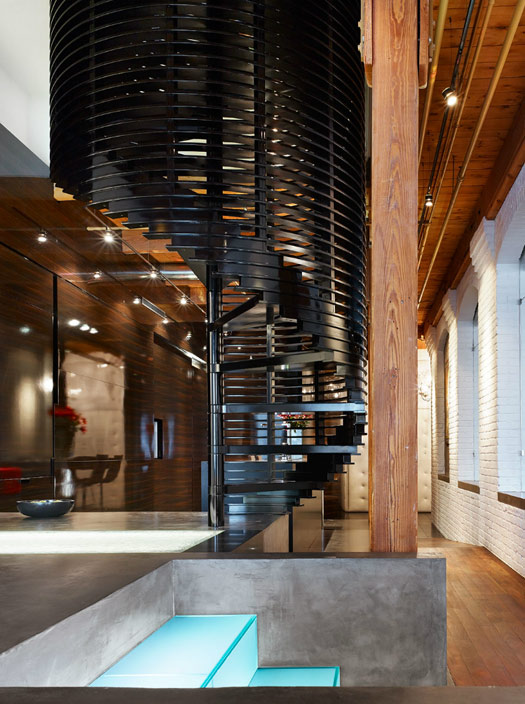Oh, I love this place. It is such a fantastic re-use of the space. So many inspiring things: those illuminated glass stairs, the modern interior with the original factory architectural elements; the bath in the bedroom; the black tile in the bathroom and modern fixtures … fantastic. Thank you so much for sharing this.