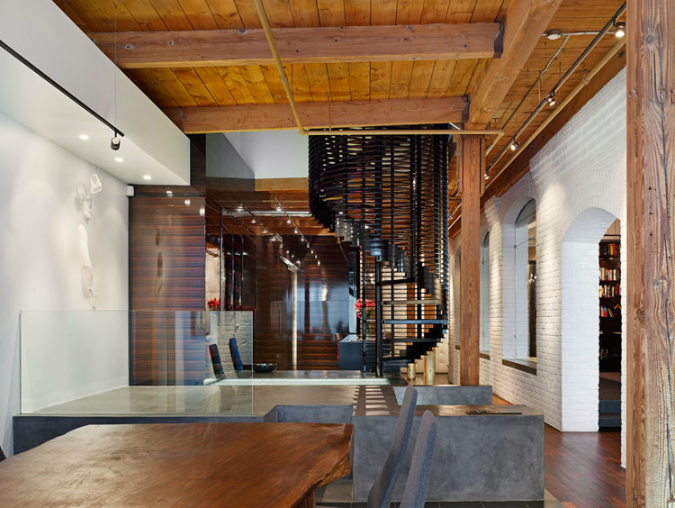 I typically dislike wood ceilings and beams because they tend to look very lumberjack-y. However, it looks really good here. The spiral staircase is especially nice but I would be worried about falling down those stairs.