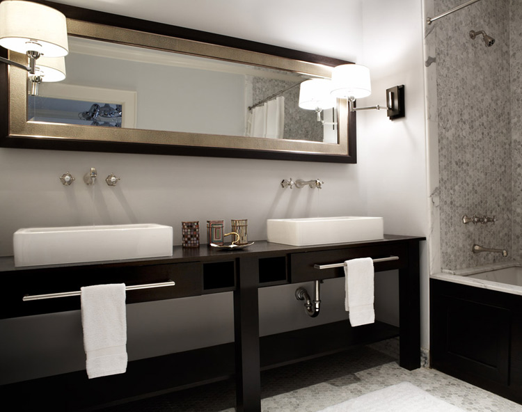 Most of the time, I'm pretty 'meh' about design firms. I mean, however innovative they might claim to be, you still get the basic couch/chairs/sidetables/fireplace set-up, with more or less leopard skin or tasteful landscape. But this is good! I like the reach towards the almost-awkward, the off-kilterness. Circles showing up where rectangles are scheduled, restraint where rococo seems to be called for, and a really subtle play with proportions and period-specific colors. Who would look into a shower installation and expect to see an egg tub? The murphy bed room is probably my favorite – a rich investment in traditional form – which the business seems to favor – but clunk! in comes a modern-pitch chandelier to echo the rug, and delicate chairs to do triple duty – lighten the atmosphere, extend the traditional flavor, and of course, stand in for bedside tables. This is what design should look like.