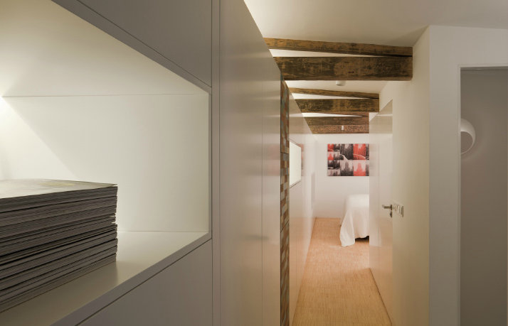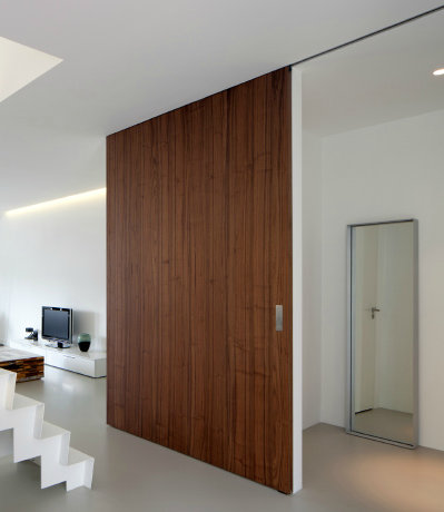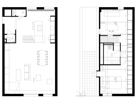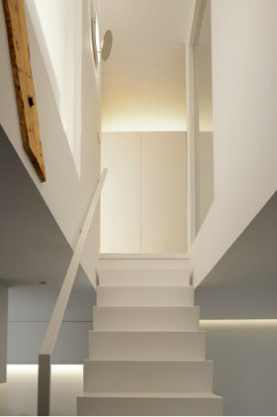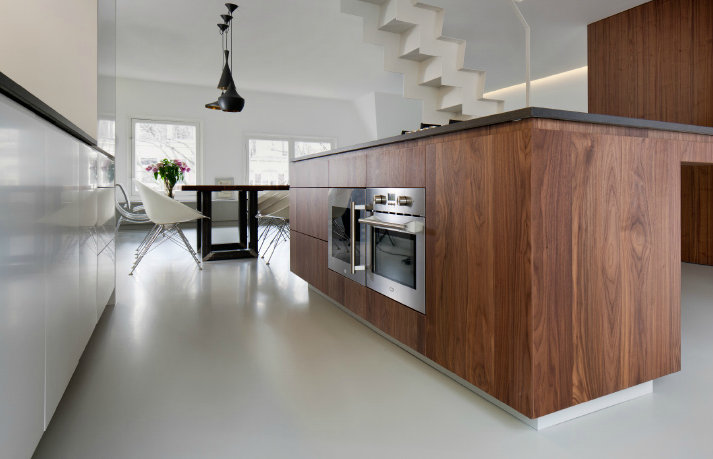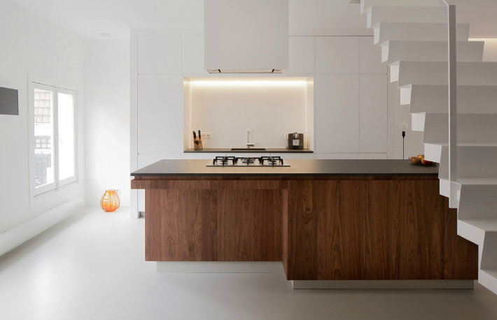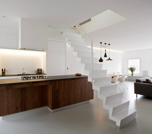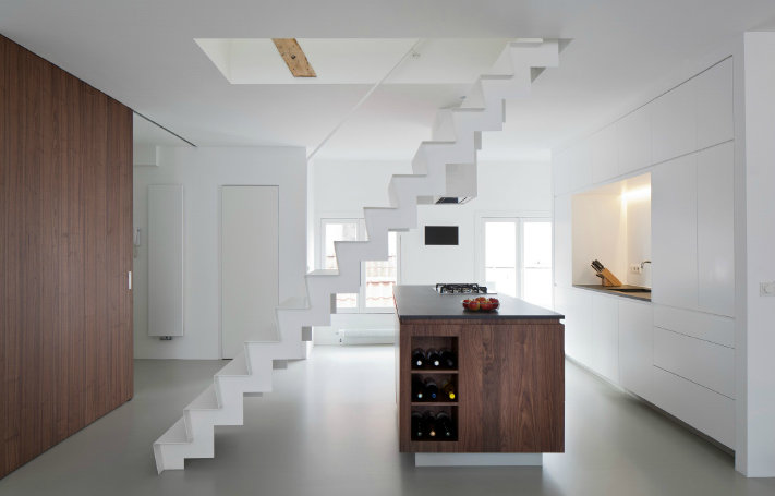 Minimalist 2 storey apartment space within a heritage building in Amsterdam. Clean lines, sharp angles, limited colour palette and smooth surfaces. Warmed by wood elements. A steel staircase angles between the levels separating the dining and living spaces in the open plan first floor. But the hero of the space is fully equipped (albeit minimalist lined) kitchen centre stage. Design by Laura Alvarez Architecture.