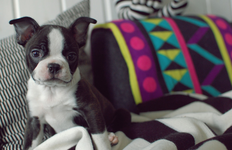 Hjalmar, our 8 weeks old Boston Terrier, enjoying our sofa, finding his place in his brand new home.