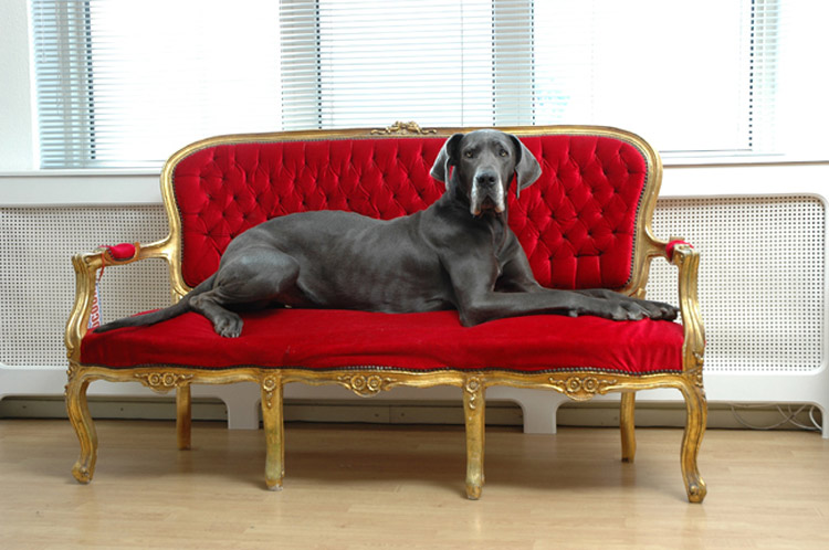 This was our Great Dane FAY! She passed away a few yers ago but was such a cutie….she was like a really scooby doo: a big little dombo and full of fear! Laying on this Barok bench was really a victory for her! In ♥ memory.