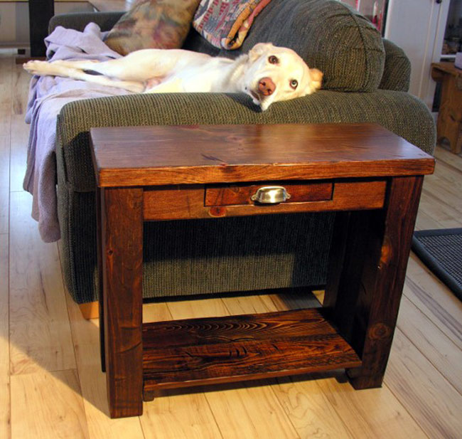 Recently adopted from the area shelter, 8 year old, Sonney, got caught snoozin’ on the couch! Sidetable with recycled pull, handcrafted by rusticbenches.ca