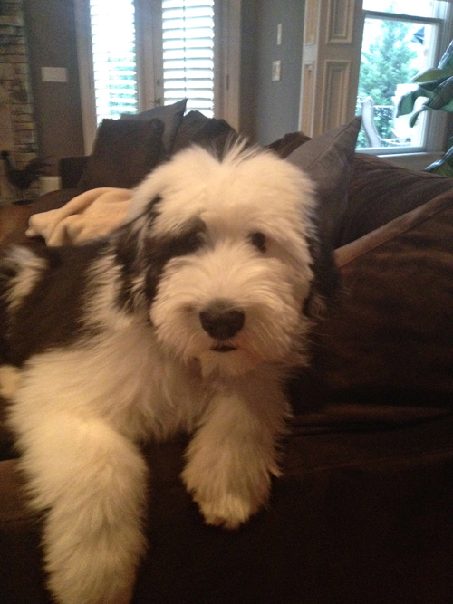 Jagger is my 5 month ( yes i said 5 months) old, Old English Sheepdog puppy. Weighing in at 41lbs already! His personality grows as much as he does each day……he loves to sit on top of the couch……not sure how much longer her will fit there…..but it’s his spot for now!