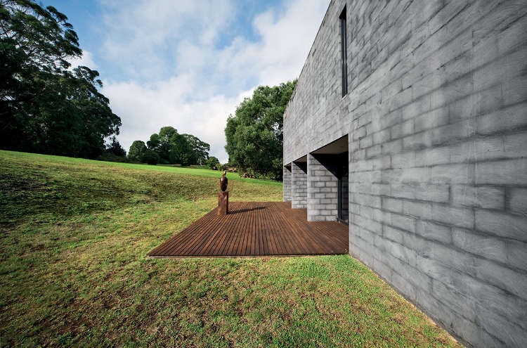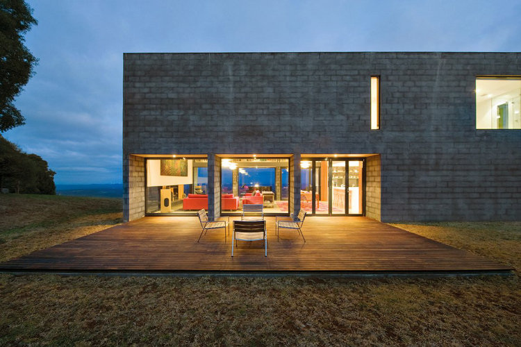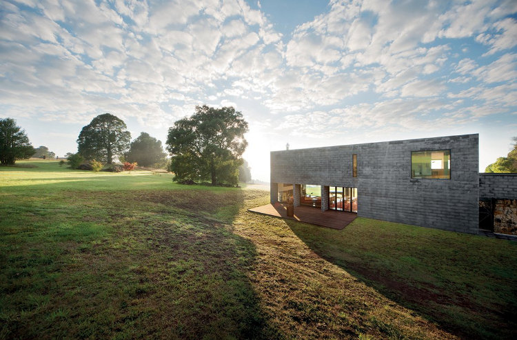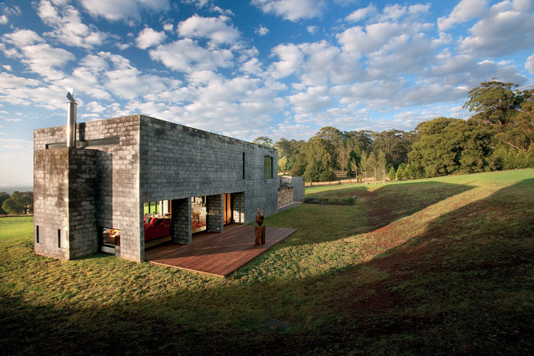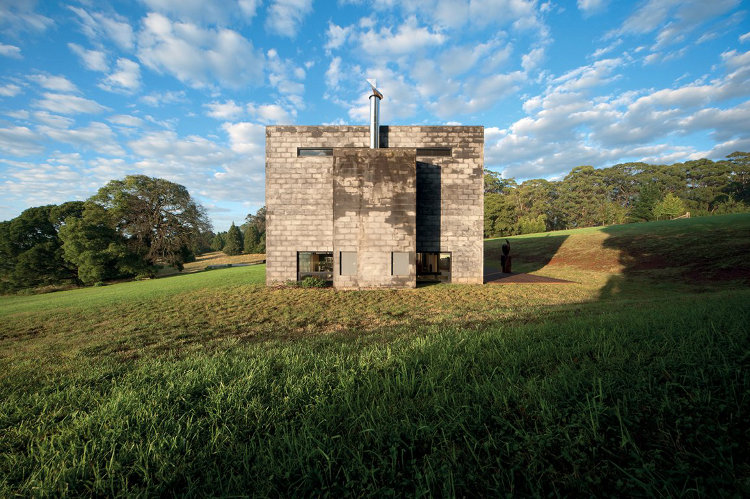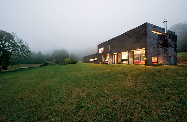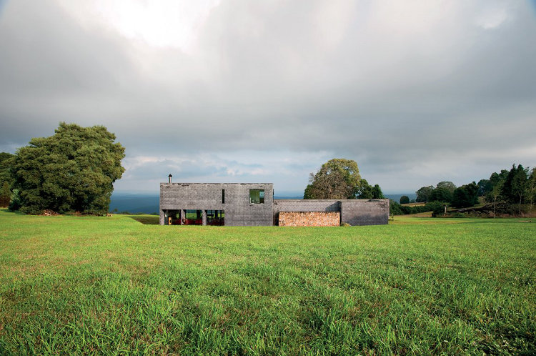 Mimicking the ancient rocks of the Blue Mountains is a house of concrete block, timber and stone left to weather. It rises like a monolith or a rocky outcrop from the sheep paddocks providing shelter from the elements, a place to retreat. The fireplace is central to the idea of hearth and home, protection and warmth. “Mending Wall” (from a line in a Frost poem) is by Australian firm BVN Architecture via World Buildings Directory.
