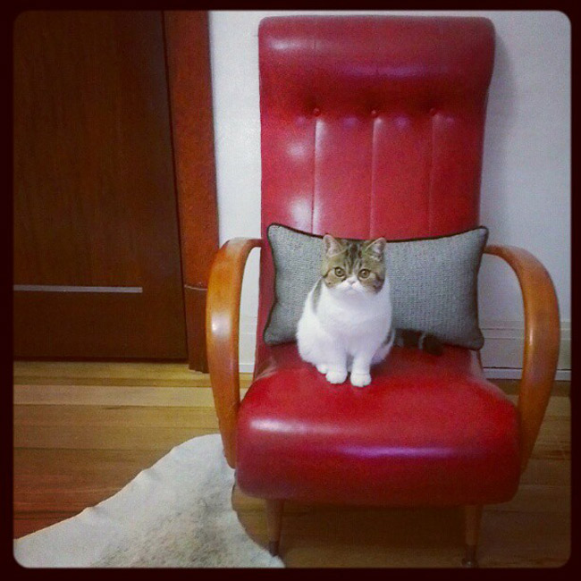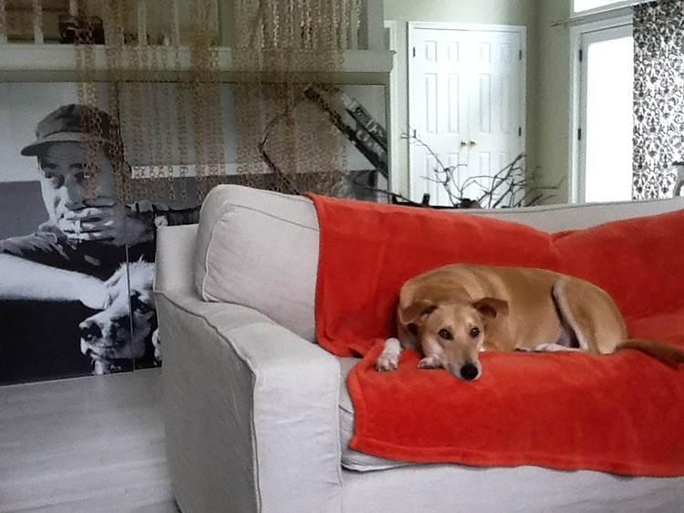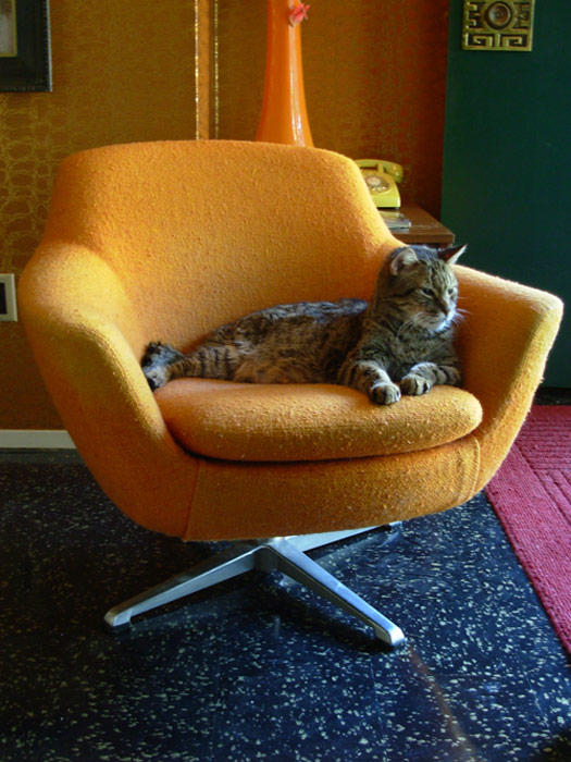 Clyde lounging on his favorite orange throw with a mural of George Nelson in the background. He’s a bit of a design snob. But then, he lives in The Hamptons, NY.