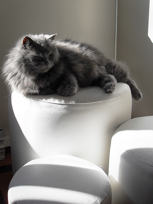 I’m sending the picture of my cat Feio (it means “ugly” in brazilian portuguese) he’s a lovely, fluffy gentle old fat guy with just one full function eye, one ill leg and a huge need for love. I adopted him about 3 years ago and I think he is about 13-14 years old right now. He almost doesn’t get to climb furniture because of his leg, but he absolutely loves sunbathing in my set of white poufs. It is the one thing, other than my lap, that he thinks it’s worth the effort.