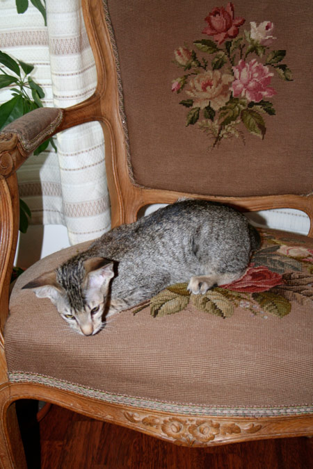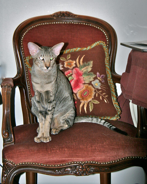 Sending you a photo of my beloved cat, in my powdery pinkish brown rococo chair. She is an Oriental Shorthair named Billie Holiday. The other picture is another rococo chair, embroidered with roses, I love this chair dearly. I am crazy about roses!