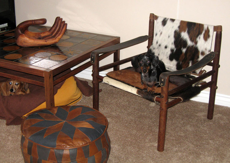 Here’s two photos of our mini dachshunds, Dash and Oscar. While Dash may be content to hang out in his dog bed under a vintage tile table (I guess that makes that photo more of a “pets under furniture” submission), our dappled mini doxie, Oscar, prefers to be covert by camouflaging himself on our vintage Arne Norell rosewood and cowhide safari chair.