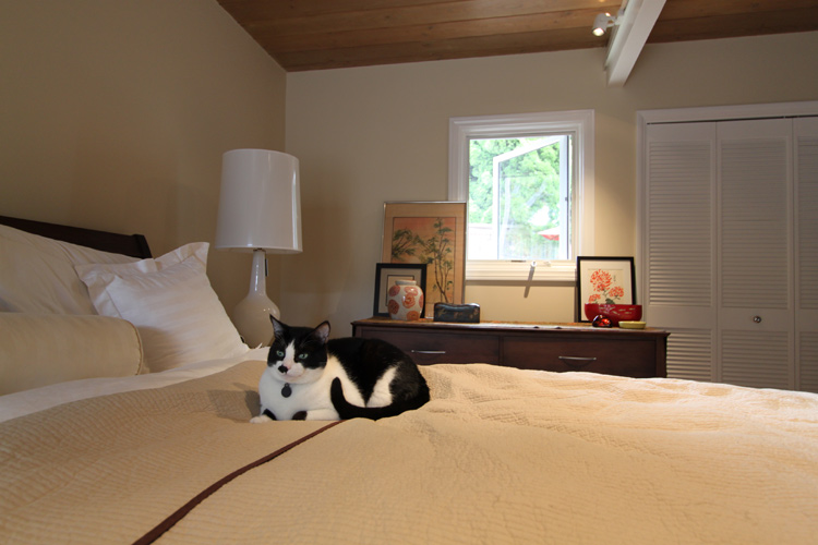 This is Jack, a rescue kitty, sitting on the bed in his recently re-modeled bedroom (note the Japanese influenced art behind him ready to be hung again). He prefers the quiet of the bedroom to the clutter and noise in the office which his sister Annie likes a lot.
