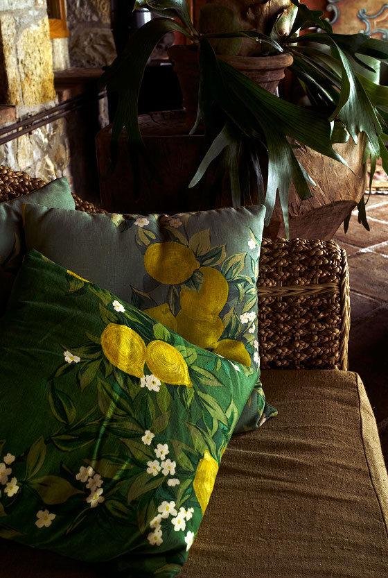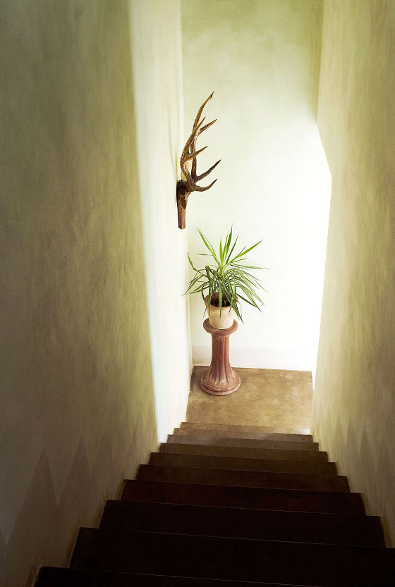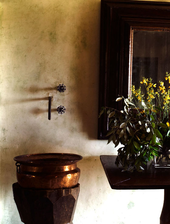 Whoever did the photographs was a genius. Yes, there's a lot of dark — but it's a pile of rock with small windows, it's going to be moody inside! I love the mood — brooding and romantic and unexpected. Cool indoors, even in the daytime you appreciate a lamp or a candle in a nook — but you also have the Italian sun breaking in now and then, promising that once you untangle yourselves (no hurry!) heat and vistas are waiting. /sigh/