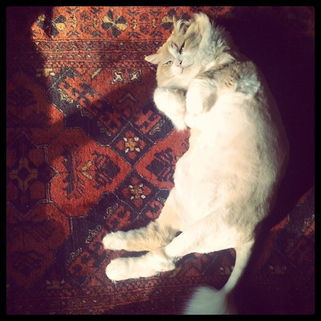 My husband and I met while working in Saudi Arabia. He brought home several beautiful (Persian? Turkish?) carpets that are now favourite lounging spots for our beloved kitty, Joey. Joey was adopted from the foster home he was born in, and he was originally named ‘Lil Joe’. Ironic, considering he now weighs over 20 pounds!