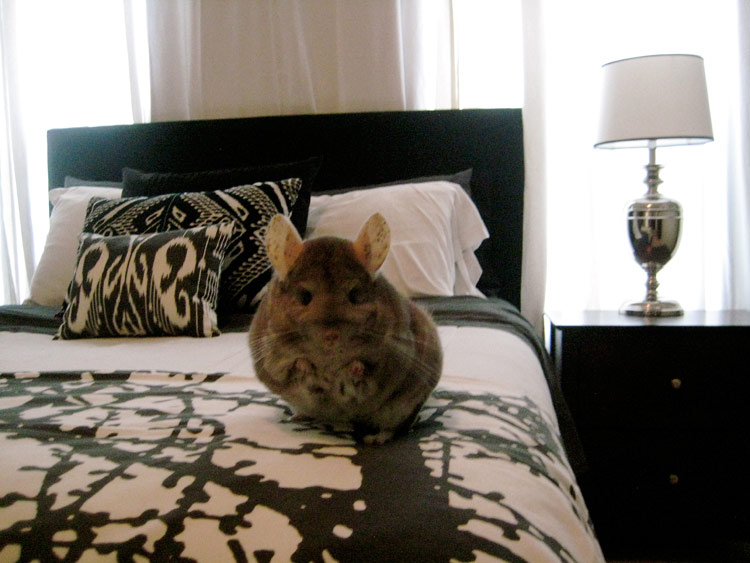 This is “Link” our Chinchilla. He loves to run around and explore on the bed, chairs, bar and shelves, so it can be tough to catch him.