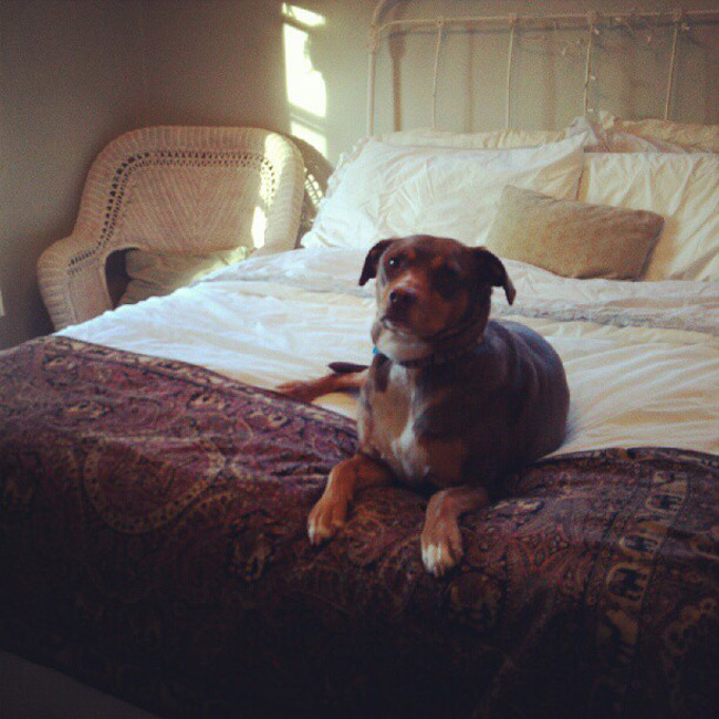 This is Beau, my 4 year old pit mix, chillaxin on my bed. He doesn’t seem to mind a bit ghat his paws are dusty from our hike, and my duvet is white…