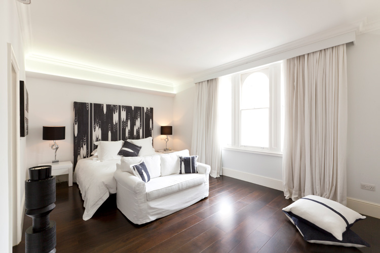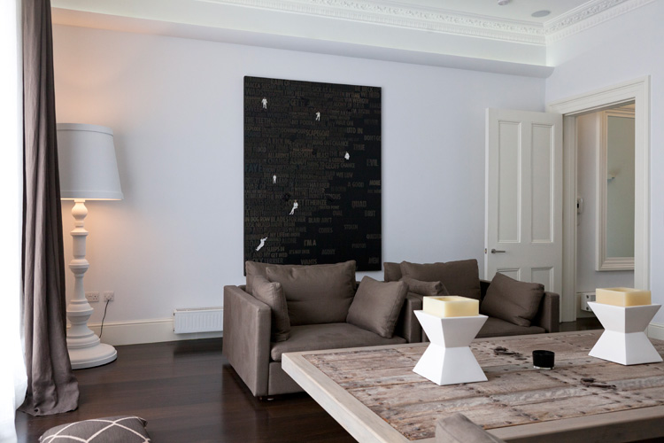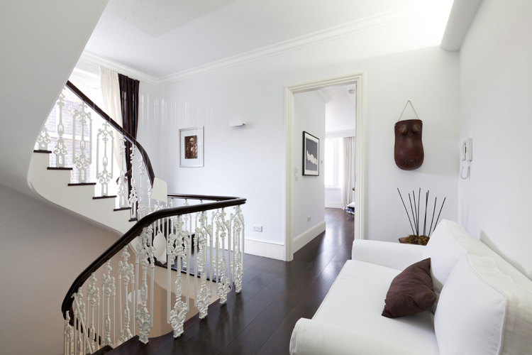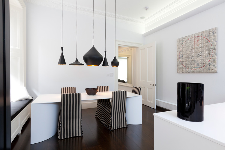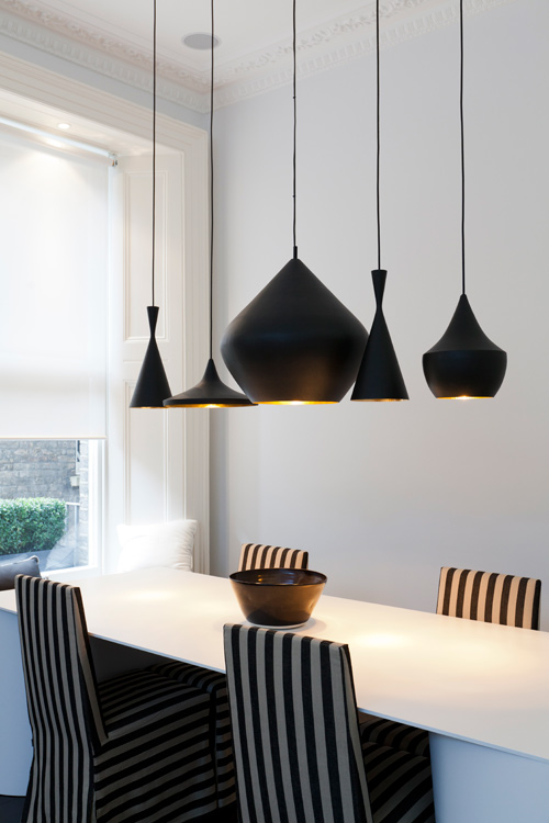 Here’s another property from Domus Nova with a big wow factor. It’s a recently remodeled triplex that features an original Victorian staircase, which houses an incredible installation of “leaves of paper” as if floating, etched with personal anecdotes of writers. The black and white colour scheme with dark wood floors is dramatic and modern, and the main attraction? The to-die-for grouping of Tom Dixon Beat lights over the dining table. I REALLY need to get my hands on a few of those, especially since I’ve been obsessing over them forever.