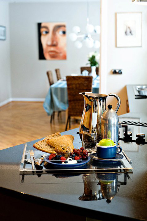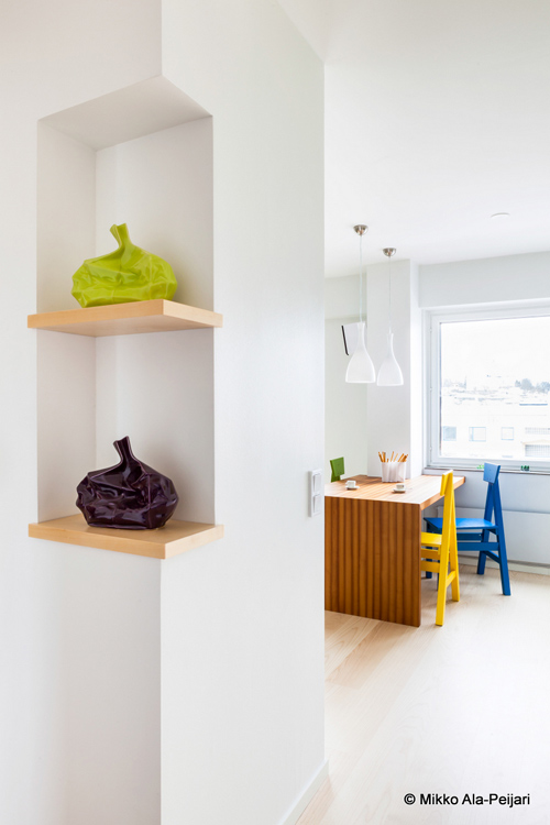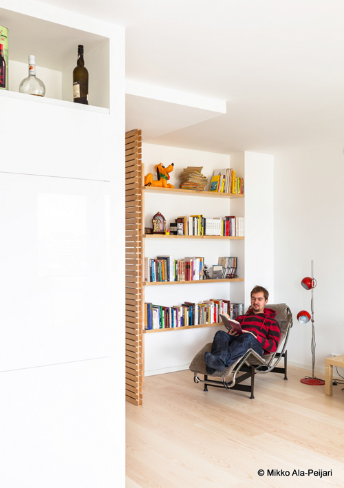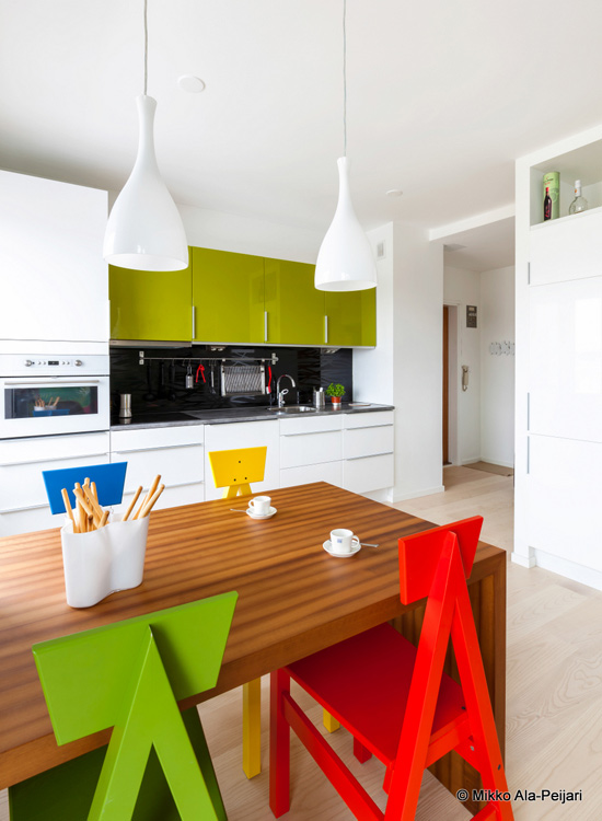 Maurizio Giovannoni, and architect and interior designer in Rome, emailed us about an apartment he designed: The apartment is a little penthouse (about 65 mq.) in Turku, Southern Finland. Before renovation, too many walls and doors blocked the spaces and the passage of light, and the most beautiful view of the historical sites of Turku was on the bedroom side. My principal goal in this project was letting the light flow in and creating a relaxing living room where my customer could do his creative work. The partial demolition of walls was a natural consequence, along with reversing the location of the bedroom and living room. After fixing this, we decided on the overall “concept” together with my customer, organizing all the details that colored the white spaces. That happened during my customer’s visit to Rome (due to my impossibility to travel in that period), and via 4oo e-mails between Turku and Rome. The result is what I now consider my style: a blend of cultures. There is nothing that stimulates me more than to study different countries and make some cultural themes recognizable but never intrusive in the project. In this case, the floor is covered with parquet of white ash, the shelves are birch and the kitchen table is also birch but colored with heat. Wood is an omnipresent element in this flat as it constantly is for Finnish people, but the real attention is catalyzed by the nature theme pictured on wall paper, carrying colours and contrasts and a typical Mediterranean “courage”. The furniture itself is a mix of the 2 cultures and of past & present: the grandmother’s armchair is a piece of Finnish vintage from the sixties as is the red floor lamp. The arc framing the wall paper is the famous Twiggy by Foscarini and the suspended lamps are Italian as well:Olimpia by Ideal Lux. Everything fits together in perfect harmony! (Photos by Mikko Ala-Peijari for Kauniit Kodit magazine)