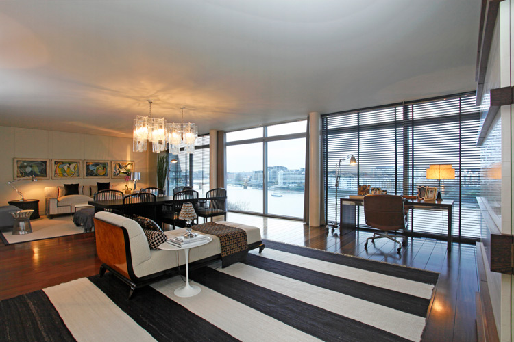 This next one is a 7th floor apartment with 3 bedrooms and 3 bathrooms in Battersea, London. The views are what got me (although both are waterfront). Hard to miss it with one entire side of the apartment being a wall of glass. I think it’s sort of unusual how the owners opted to have the dining table in the center of the large living space. It acts as a divider and creates 2 distinct living rooms (or reception rooms to Brits). I REALLY need to find that large black and white striped rug – LOVE!!! (Link here)