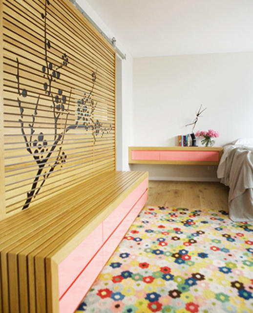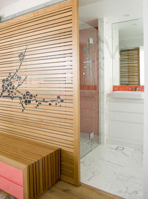 Fantastic sense of color, and lovely play of textured surfaces. I love the bathroom tucked off the Master, hidden behind the sliding slatted screen. Thank you for sharing her work. Looking forward to seeing her darker side!!