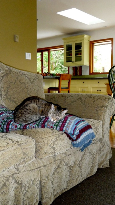 Our tabby Lucy’s morning couch nap in our  living/dining/kitchen room
