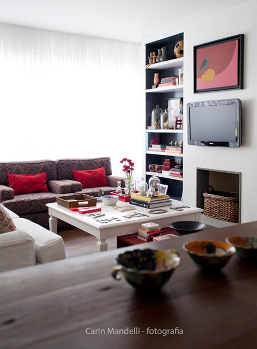 Great presentation of the TV, it blends in beautifully. The kitchen is so funky and productive-looking. I love the little collections, and styling, the modern furniture against the ageless pottery and typefaces. I usually dislike the sofa/two chairs/table tableau — it's a traditional layout that doesn't match modern lifestyles — but this set-up turns the ordinary sideways, and gives it a charming old-world feel that looks comfortable for multiple uses. Beautiful apartment.