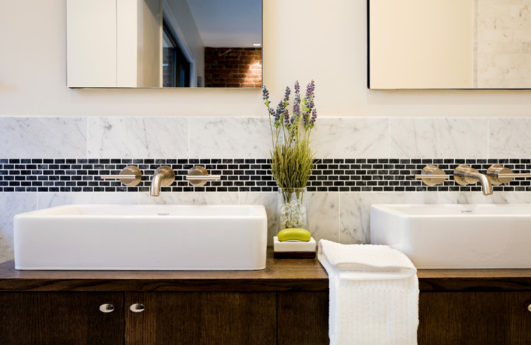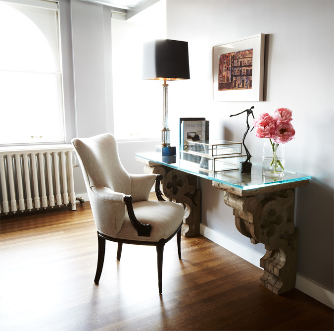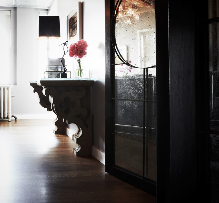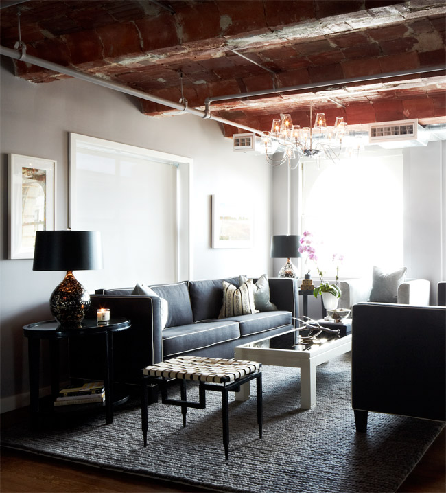 Jordan Carlyle of NYC interior design firm Carlyle Designs emailed us about his work and thought we’d like to share some of his projects with our readers. You’ll see why I didn’t hesitate to say yes in a moment. First, a little bit about Jordan: Characterized by earthly surfaces, singular details and keen colors richly layered across an architectural framework, Jordan’s designs recast classic elements in modern settings. It’s an approach that pays homage to timeless notions of sophistication as surely as it spritzes them with modern zest and sheds the stuffy overtones of elegance to reveal its sexy young skin. Jordan’s understanding of the exceptional and his love for the refined continue to be the core of his design philosophy. I was shocked to discover Jordan is only 29, and not only am I already smitten with his work, it turns out he has collection of beautiful custom furnishings (Carlyle Collective) and produces contemporary artwork (for CB2 for over 4 years!) found here. I am thoroughly impressed. So impressed I need to do two posts. To begin, here are two projects – the first is an industrial loft gone elegant, and the second, a dreamy bathroom.