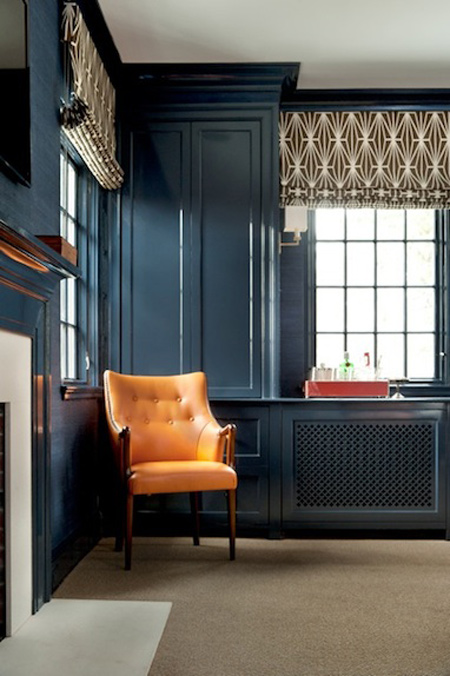 Love the paint color and roman shade fabric in the blue walled room with the orange chair. Names of these available?