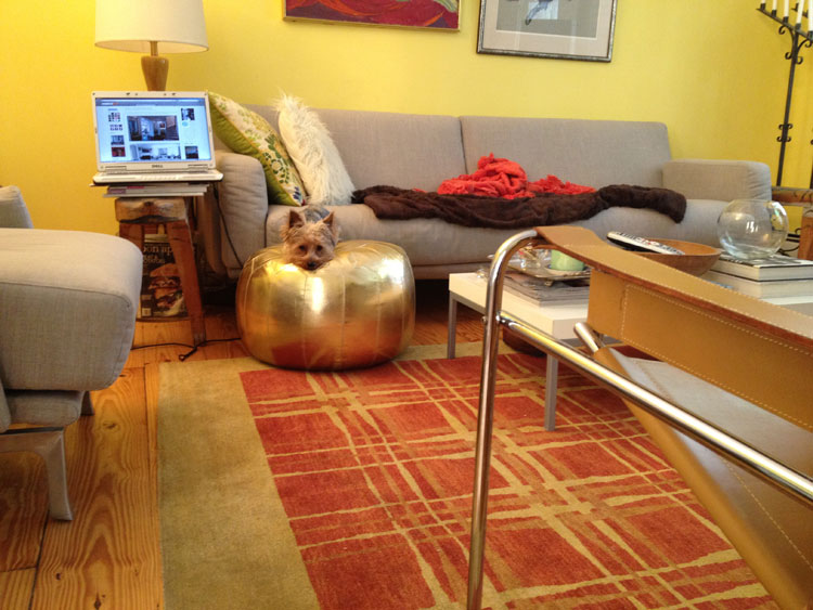 This is Buster, my one year old Yorkie. He loves to lay on my gold pouf.