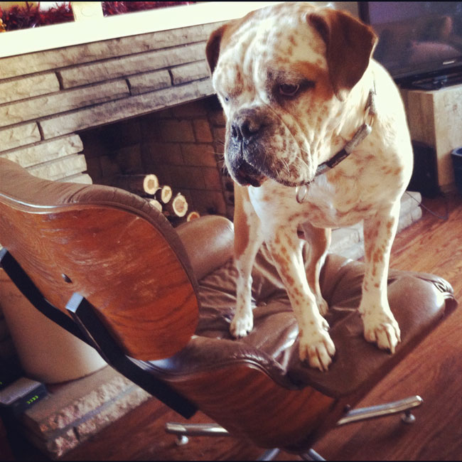 Here is Pearl (boxer bulldog cross), our beautiful rescue dog. We adopted her & she adopted the eames lounger, her favourite place to sleep!