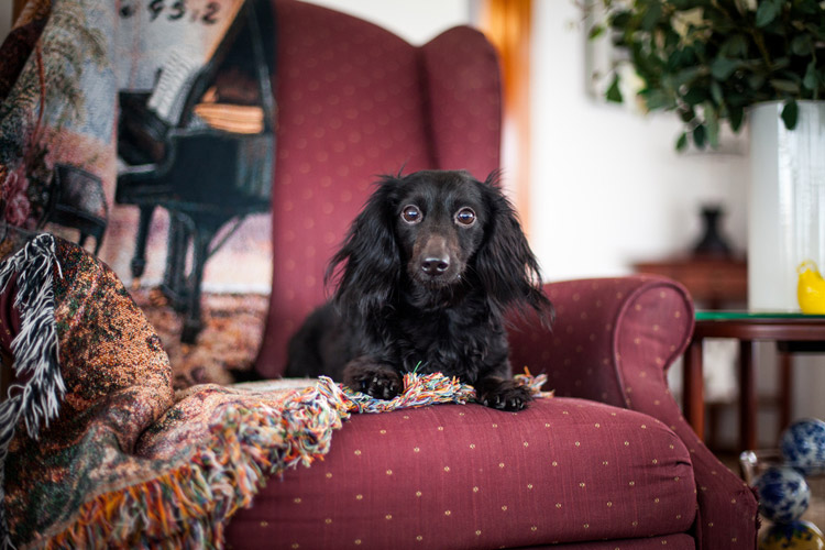 His name is Anubis, and he’s a long haired dachshund. In this photo he is visiting my mother-in-laws house and loves it because she has a lot of beautiful chairs for him to feel like a tall dog on!