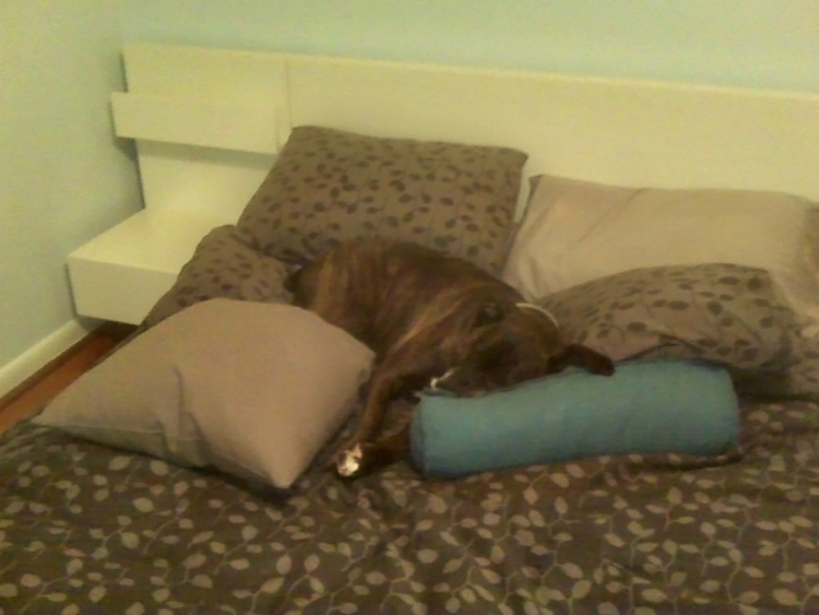 Although the quality of this photo could be better, it is of our beloved Bailey whom we were forced to say goodbye to last week. She loved to sneak into the guest room and make herself at home with the pillows for a snooze. We miss her dearly and the house is too empty without her.